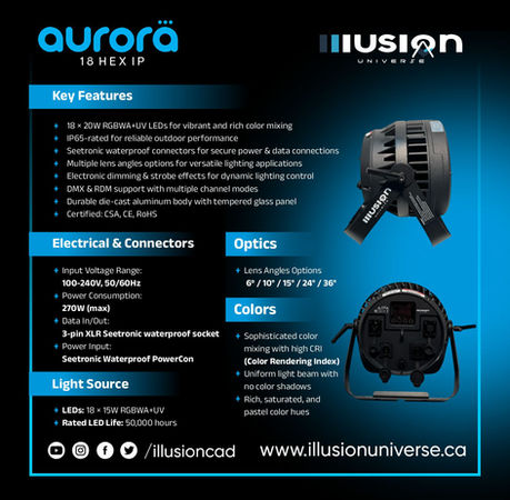 The Aurora 18-HEX-IP by Illusion Universe is a state-of-the-art IP65-rated static wash light, engineered for professional stage lighting, architectural illumination, and outdoor events. Featuring 18 x 15W RGBWA+UV LEDs, multiple beam angle options, and advanced color mixing technology, this fixture delivers exceptional brightness and versatility. Designed with Seetronic waterproof connectors and a robust die-cast aluminum housing, the Aurora 18-HEX-IP ensures reliable performance in any environment.
