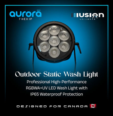 The Aurora 7-HEX-IP by Illusion Universe is a state-of-the-art IP65-rated static wash light, engineered for professional stage lighting, architectural illumination, and outdoor events. Featuring 7 x 20W RGBWA+UV LEDs, multiple beam angle options, and advanced color mixing technology, this fixture delivers exceptional brightness and versatility. Designed with Seetronic waterproof connectors and a robust die-cast aluminum housing, the Aurora 7-HEX-IP ensures reliable performance in any environment.