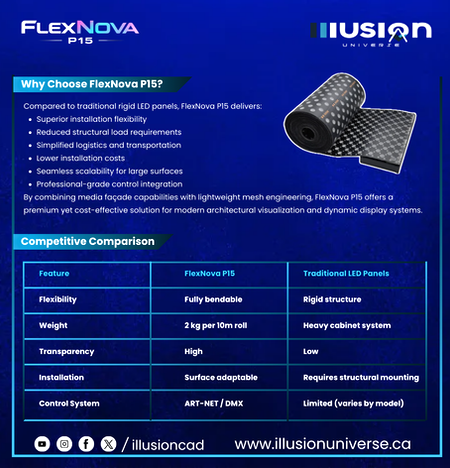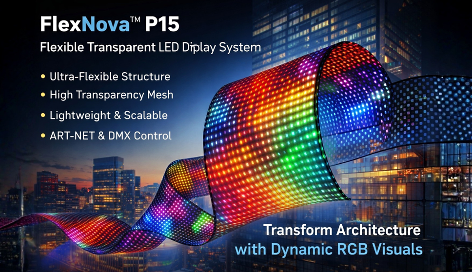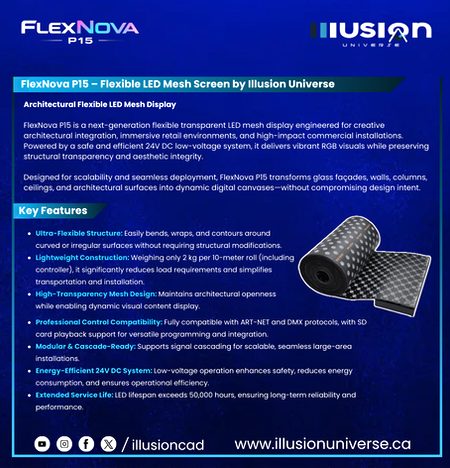 FlexNova P15 by Illusion Universe is a 24V flexible transparent LED mesh display with P15 pixel pitch, ART-NET & DMX compatibility, and lightweight roll-based installation. Designed for architectural media facades, retail environments, and creative lighting applications, it offers high flexibility, modular scalability, and professional-grade control integration.