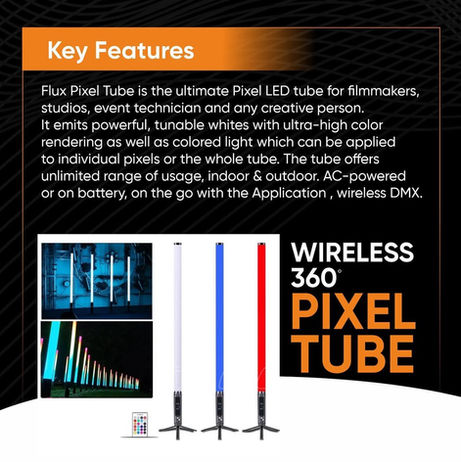 Built with durability and convenience in mind, it combines robust construction with user-friendly controls, ensuring dependable performance even in demanding production environments. Whether you're lighting a close-up shot, enhancing a live performance, or designing a large-scale visual experience, the Flux Pixel Tube delivers professional results every time.