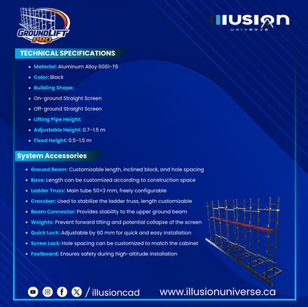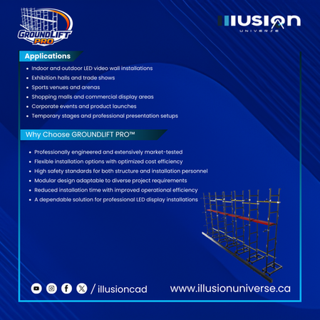 Designed with flexibility and performance in mind, GROUND LIFT PRO™ integrates a modular framework with an adjustable lifting mechanism, allowing installers to adapt quickly to varying site conditions and display heights. Its high-strength aluminum construction ensures excellent load-bearing capacity while maintaining lightweight handling, making it ideal for professional event setups, commercial displays, and temporary or semi-permanent installations where safety, speed, and structural integrity are critical.