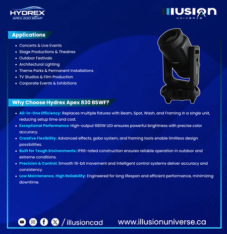 Built to perform in the most demanding environments, the Hydrex Apex 830 BSWF integrates advanced beam, spot, wash, and framing capabilities into a single fixture. Its intelligent optical system ensures sharp projections, smooth color mixing, and dynamic effects, allowing lighting designers to unlock limitless creative possibilities.