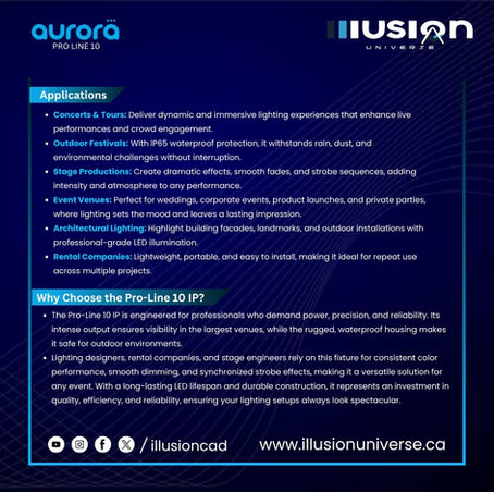 Designed with an IP65 waterproof housing, the Pro-Line 10 IP is built to withstand outdoor conditions, ensuring reliability, durability, and consistent performance even in demanding environments. Whether it’s a touring concert, a music festival, or a permanent installation, this fixture is the perfect combination of power, performance, and protection.