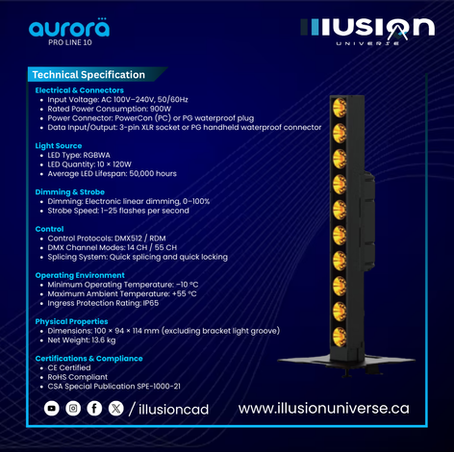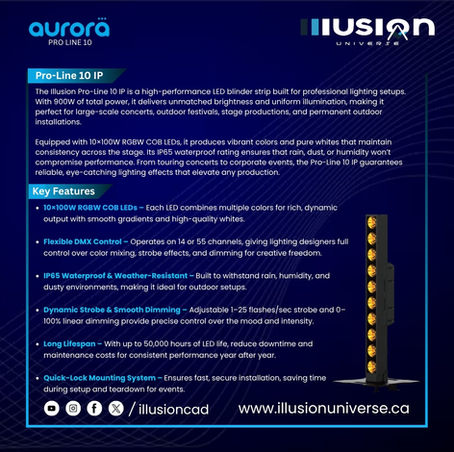 The Illusion Pro-Line 10 IP is a powerful outdoor LED blinder strip crafted for professional stage and event lighting. With 900W of total power, it produces intense and uniform brightness, making it ideal for concerts, outdoor festivals, stage productions, and large-scale events.