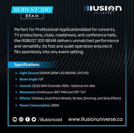 Purpose-built for concerts, touring productions, nightclubs, and broadcast environments, the ROBUST 200 BEAM combines speed, accuracy, and reliability to meet the demands of modern lighting design.