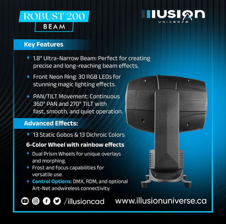 The ROBUST 200 BEAM redefines compact beam lighting by delivering uncompromising performance in a sleek, lightweight form factor. Crafted for lighting professionals who demand precision and power, this next-generation moving head fixture transforms any stage into a visually immersive experience.